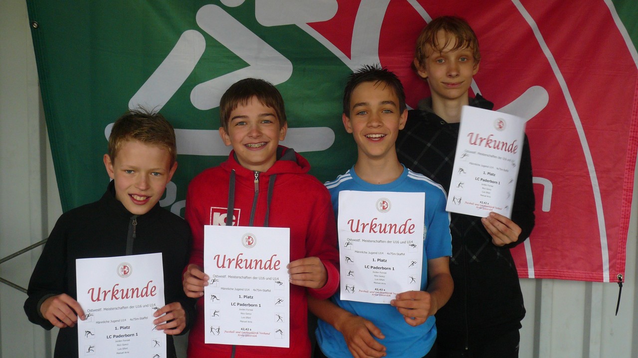 Perfekt abgestimmt ging die 4x75m-Staffel der MJ U14 mit Jorden Forrest, Manuel Arns, Luis Elfert und Nico Goncz an den Start und erlief den ersten Titel bei den diesjährigen OWL-Meisterschaften in 42,42 sec.