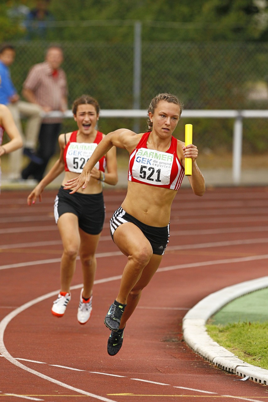 Senta Borlisch feuert nach der Staffelübergabe in 4x100-Meterstaffel Chantal Butzek an, die die Staffel anschließend zum Sieg läuft.