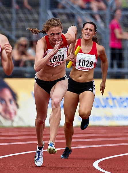 LC Sprinterin Janina Kölsch (vorne) nimmt schon einmal Fehrt auf. Josefina Elsler läuft auf ihre Teamkollegin auf.