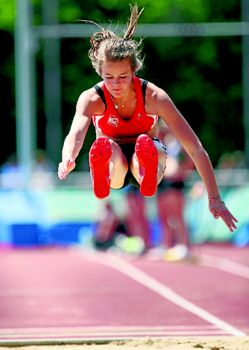 Schöner Sprung: Katharina Schweiker gewinnt den Weitsprung der W15 mit 4,96 Metern. Sie siegt auch im Kugelstoßen und mit der 4×100 Meter-Staffel des LC Paderborn. Fotos: Thomas Finke