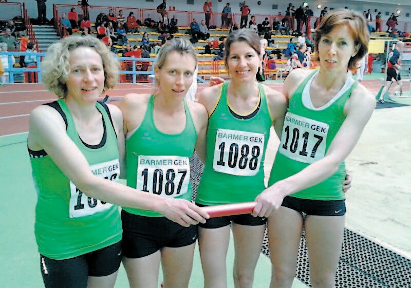 Gold Quartett: Jutta Bergener, Gunhild Kalis, Michaela Zwiener und Kerstin Drewes-Czech (v. l.) von der SG Paderborn/Neuhaus/Höxter wurden ihrer Favoritenrolle über 4 x 200 Meter der W40 gerecht. Mit gut zwei Sekunden Vorsprung holten sie den DM-Titel. (Foto: Privat)
