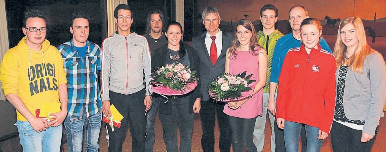 Ulrich Woischner (Mitte), der Vorsitzende des LC Paderborn, ehrte im Verlauf der Mitgliederversammlung folgende LCer für herausragende Leistungen (von links): Niclas und Philipp Petri, Kay Schmalstieg, Thomas Prange, Josefina Elsler, Ina Thimm, Mathis Blank, Michael Krusemark, Tatjana Schulte und Chiara Struckmeier. (Fotos: Thomas Finke)