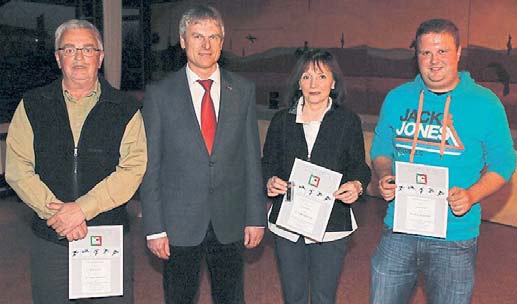 Rainer Wokittel (links) und Christina Arntz (Zweite von rechts) wurden von Ulrich Woischner (Zweiter von links) für 30-jährige Mitgliedschaft, Tobias Wokittel (rechts) für 25 Jahre im LC Paderborn geehrt.