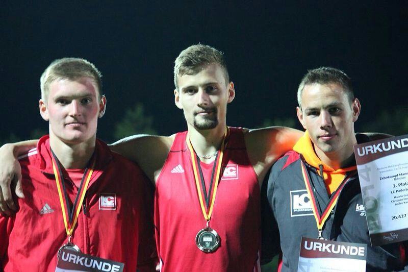 Paderborn (FB). Bei Andre Karasch lief es in dieser Sommersaison gar nicht rund. Dem 21-jährigen Zehnkämpfer vom LC Paderborn machten immer wieder muskuläre Probleme zu schaffen. So musste Karasch die Wettkämpfe beim Traditionsmeeting in Bernhausen und bei den Westfälischen Meisterschaften in Bad Oeynhausen vorzeitig abbrechen. Doch am vergangenen Wochenende gab es bei den Deutschen Mehrkampfmeisterschaften im bayrischen Vaterstetten ein Happy-End: Zum einen sicherte sich Karasch Einzel-Bronze in der Altersklasse U23. Zum anderen holte er mit seinen Vereinskollegen Marvin Gregor und Christian Herrmann Silber in der Männer-Teamwertung.