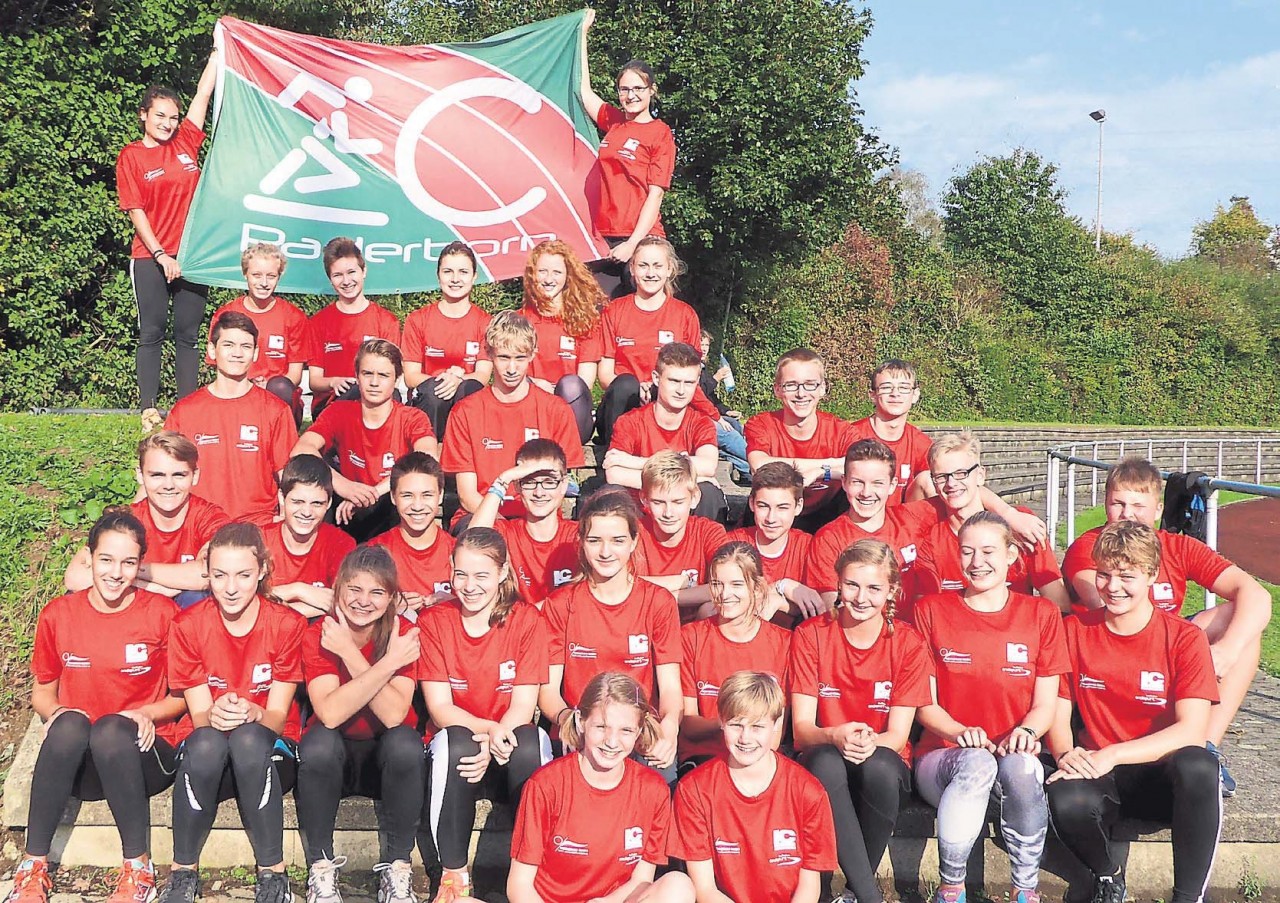 Der Nachwuchs des LC Paderborn: (vorne von links) Malin Bokel, Kea Wagemann; (erste Reihe) Henrike Beverungen, Luzie Probst, Estelle Potthast, Greta Gamm, Emma Kulig, Laura Keuper, Laura Grundmeier, Fiona Halbig, Franca Bredebusch; (zweite Reihe) Louis Schreier, Nico Austerschmidt, Thimoteé Tenberg, Roland Stroop, Max Stornebel, Julius Dreker, Ruben Vogt, Lukas Papenkordt, Filip Frenzel; (dritte Reihe) Lucas Casao, Niklas Dierkes, Jordan Forrest, Vincent Rehse, Frederik Traub, Dominique Gürth; (vierte Reihe) Rieka Wagemann, Sarah Karmeier, Karen Schiwon, Nicola Looschelders, Laura Pazmandi sowie (stehend mit LC-Fahne) Senta Borlisch und Lena Beine. (Fotos: WV)