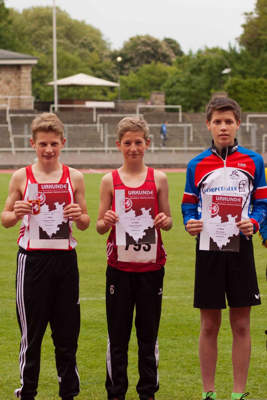 Das Treppchen der M14 über 2000 Meter: Leonhard Scheike (LC Platz 1), Christian Hartmann (LC Platz 2) und Phil Schmidt (SC Hagen Platz 3).