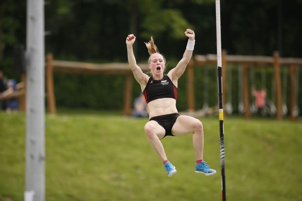 Anjuli Knäsche von der Fernuni Hagen jubelt schon in der Luft nachdem sie mit übersprungenen 4,55 Metern nicht nur Deutsche Hochschulmeisterin geworden ist, sondern auch noch die Qualifikation für die Olympischen Sommerspiele überboten hat.
