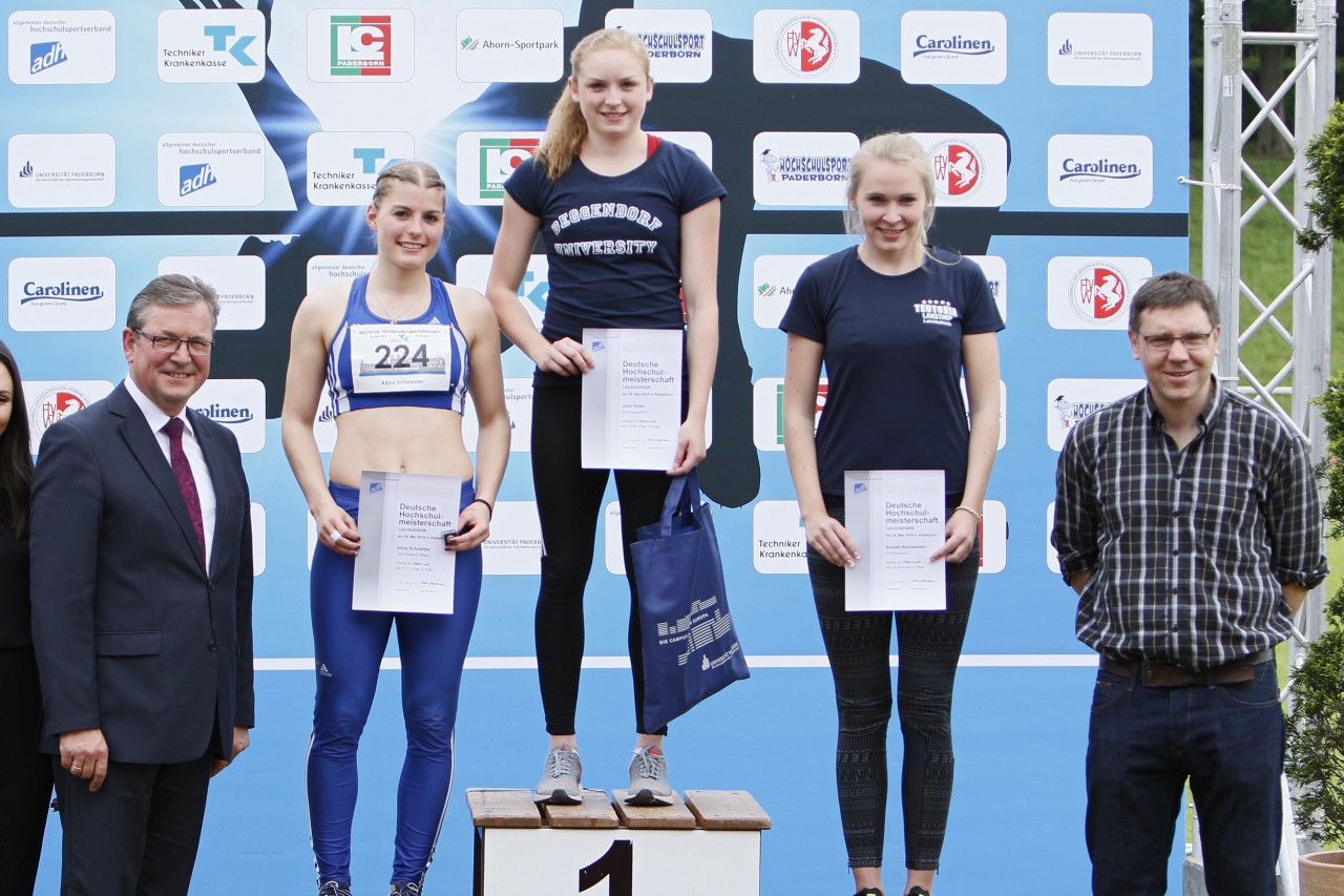 Rund 400 Studentinnen und Studenten waren für diese Wettkampf in den Ahorn-Sportpark gereist, um einerseits um den Titel des Deutschen Hochschulmeisters zu kämpfen, aber andererseits auch um noch die nötigen Qualifikationen für die anstehenden Leichtathletikmeisterschaften zu erlangen. So zeigten sich Aktive, Trainer, Funktionäre, aber auch Paderborns Bürgermeister Michael Dreier mehr als begeistert von der Veranstaltung. „Paderborn ist eben eine Sportstadt“, stellte Bürgermeister Dreier fest. Er bedankte sich aber auch bei Renate Nixdorf, stellvertretend für ihren Mann Heinz Nixdorf, der seinerzeit den Ahorn-Sportpark gebaut und dem Paderborner Sport zur Verfügung gestellt hatte.