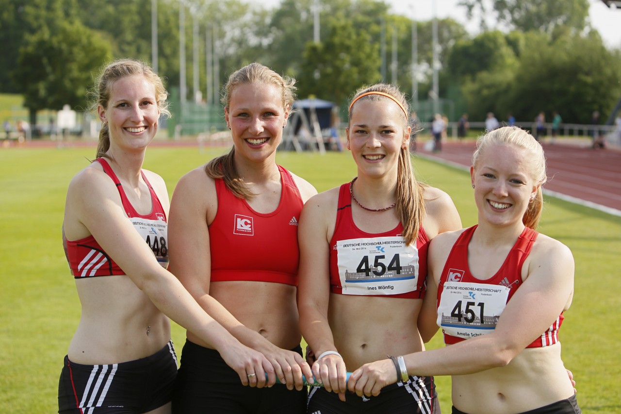 Die Staffel der Uni Paderborn mit (v.L.) Kirsten Liening-Ewert, Sarah Noll, Ines Wäntig und Amelie Schröer wird Vizemeister in starken 49,50 Sekunden