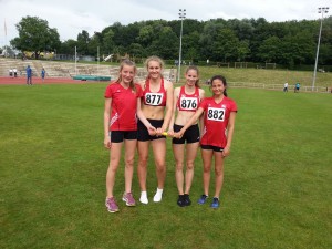 Können nach ihrem Sieg bei den OWL Meisterschaften für die U16 DM in Bremen planen: Die weibliche 4×100 Meter Staffel. v.l. Elisa Rustemeier, Johanna Korinth, Jana Kirsch und Anna Semmler