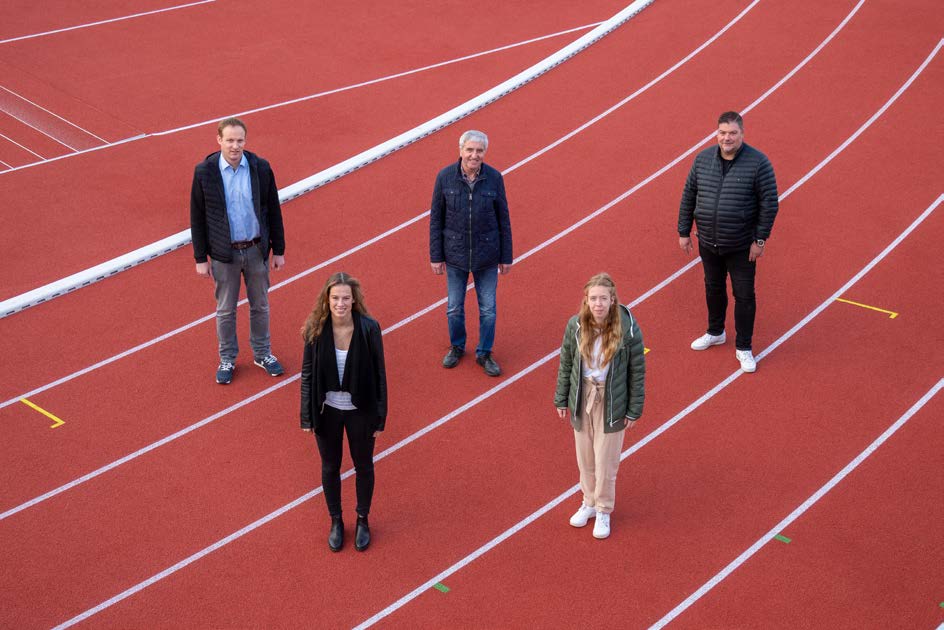 Foto: von links: Christoph Plöger, Lea Schulte, Konrad Schwarze, Maren Richts (alle Ahorn-Sportpark gGmbH), Dirk Mühlenweg (Polytan GmbH)