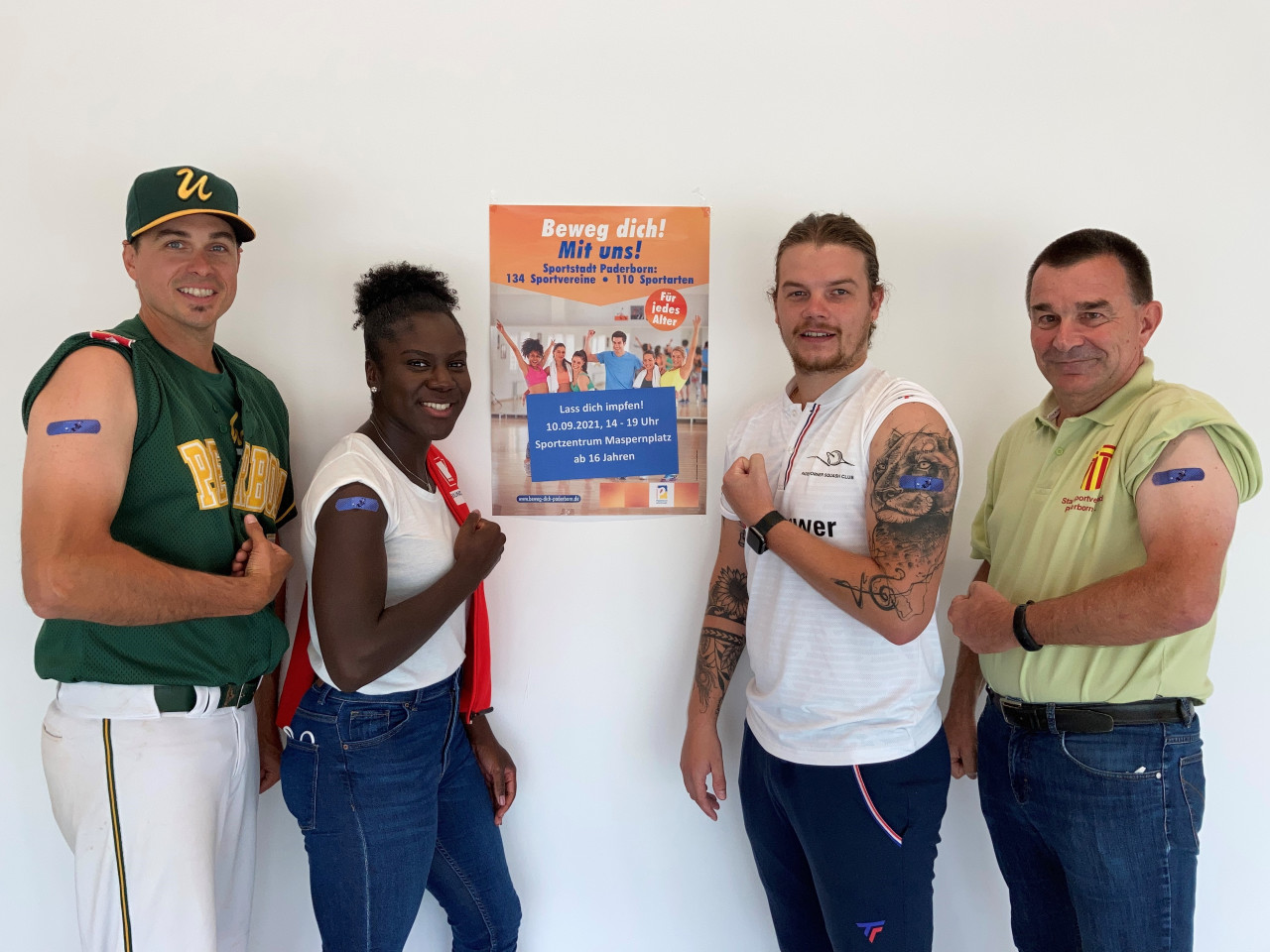 Matt Kemp (Untouchables Paderborner Baseball Club), Keshia Kwadwo (LC Paderborn), Hendrik Vössing (Paderborner Squash Club) und Mathias Hornberger (Vorsitzender Stadtsportverband Paderborn) rufen zur Impfaktion am 10.09.2021 von 14 bis 19 Uhr im Sportzentrum Maspernplatz auf.