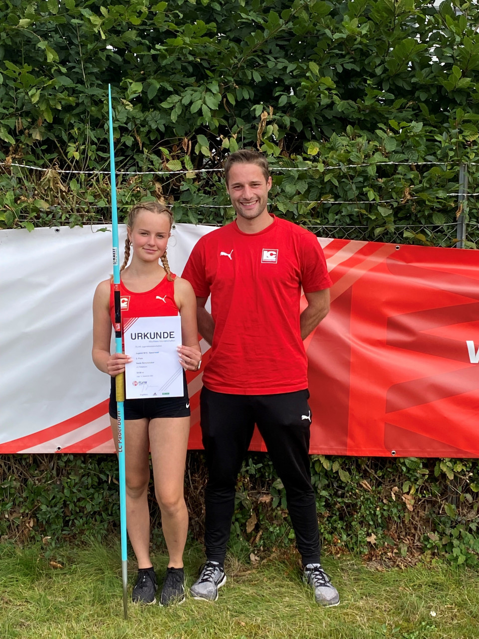 Ebenfalls Vizemeisterin wurde Neele Berenbrinker im Speerwurf der W15. Mit einer starken Wurfserie standen schlussendlich 34,99 Meter für die Athletin von André Meyer zu buche.