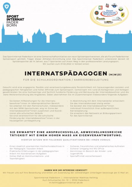 Das Sportinternat Paderborn sucht zum 01.02.2022 im Rahmen einer Nachbesetzung einen Internatspädagogen (m/w/d).