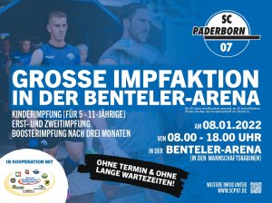 Eine zweite Impfaktion in der Heim- und Gästekabine führt der SCP07 in Kooperation mit der Forum Paderborner Spitzensport gGmbH am Samstag, 8. Januar, in der Benteler-Arena durch. Von 8.00 Uhr bis 18.00 Uhr können sich alle Interessierten impfen lassen. Das Impfangebot richtet sich auch an Kinder zwischen fünf und zwölf Jahren, für die der Kinderimpfstoff von BioNTech in größerer Menge zur Verfügung steht. Bei Erst-, Zweit- und Auffrischungsimpfungen (Booster) für Personen ab 12 Jahren sind die Impfstoffe BioNTech (für unter 30-Jährige und Schwangere, solange der Vorrat reicht) und Moderna verfügbar.