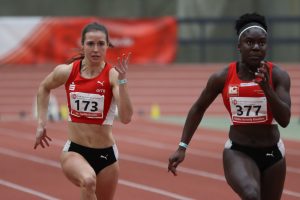 Eines der Highlights an diesem Wochenende lieferten die schnellen Damen im 60-Meter-Sprint. Hier trommelten Yasmin Kwadwo (7,41sec), Keshia Kwadwo (7,44sec) und Kathrin Grenda (7,48sec) – Letztere konnte hier außerdem wie erhofft eine neue Bestzeit aufstellen – schnelle Zeiten auf die Bahn uns sicherten sich damit die Plätze eins bis drei. „Die Zeiten, die ich gelaufen bin, waren nicht das, was ich mir gewünscht habe, weil ich doch einige Fehler gemacht habe in den Läufen, die es gilt in den nächsten Rennen zu vermeiden. Nach Außen hin scheinen die Zeiten nicht berauschend auszusehen, aber ich weiß was ich kann und wie der Plan ist“, resümiert Yasmin, die bereits am Freitag beim international hochkarätig besetzten Indoor Meeting in Karlsruhe erneut an den Start gehen wird, nach ihren Rennen in Dortmund. „Mit dem Einstieg in die Hallensaison bin ich nach einer anstrengenden Klausurphase zufrieden, aber in meinen nächsten Rennen möchte ich mich noch deutlich verbessern“, kommentiert die angehende Bundespolizistin Keshia.