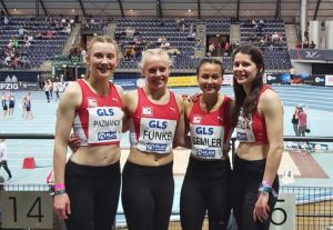Einen weiteren Grund zur Freude gab es für Sprinterin Kathrin Grenda, die ihrer Ankündigung Taten folgen ließ und im Halbfinale der 60 Meter zu 7,46 Sekunden und neuer Bestzeit sprintete. „Kathrin hat ein sehr gutes Rennen auf der Außenbahn gezeigt. Leider fehlten drei Hundertstel für das Finale, aber sie hat sich super verkauft und ich bin gespannt auf den Sommer“, zeigt sich Trainer Thomas Prange nach dem Lauf sehr zufrieden mit der Leistung seiner Athletin. Mit genau derselben Zeit von ebenfalls 7,46 Sekunden reichte es leider auch für Yasmin und Keshia Beverly Kwadwo, die sich im vergangenen Sommer der Trainingsgruppe von Hans-Jörg Thomaskamp in Leverkusen angeschlossen haben, nicht für das Finale der Frauen. „Ich hätte meinen Start zurückziehen müssen, weil ich doch zu viele Beschwerden hatte und dann läuft man nicht frei“, so Yasmin, die sich für die DM eine neue Saisonbestzeit vorgenommen hatte. Für einen weitere Top-Ten-Platzierung sorgte außerdem zum Abschluss des Meisterschafts-Wochenendes die 4×200-Meter-Staffel der Frauen mit Kathrin Grenda, Anna Semler, Marlene Funke und Laura Pazmandi, die sich in einer Zeit von 1:42.92 Minuten auf Rang neun in der Gesamtwertung wiederfinden konnten. „Wir sind sehr zufrieden – Wir sind ja auch das erste Mal in dieser Besetzung gelaufen und es hat auf jeden Fall viel Spaß gemacht“, kommentiert Startläuferin Grenda.
