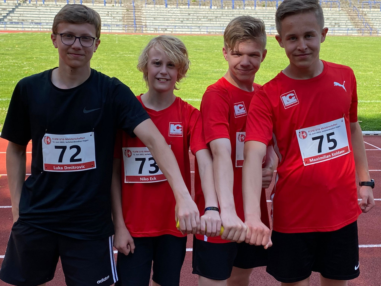 Niko Eck, Luca Ehle, Luka Dmitrovic und Maximilian Koldaev (U16) sprinteten gemeinsam in 49,92 Sekunden zu Bronze. Koldaev wurde außerdem im B-Finale über die 100 Meter Vierter in 12,68 Sekunden. Für Staffelkollege Dmitrovic (M15) gab es eine weitere Medaillenposition an diesem Tag, denn mit übersprungenen 2,70 Metern sicherte er sich Rang zwei im Stabhochsprung der M15. Außerdem gab es für den Athleten aus der Trainingsgruppe von Susanne Müller-Krusemark Rang fünf über die 300 Meter. Zum ersten Mal startete Luis Butterwegge (M15) in Hagen über die 300 Meter. Durch seine Zeit von 47,75 Sekunden, die den Silberrang bedeuteten, erlief sich Butterwegge die erforderte Zusatzleistung für die U16-DM und macht damit seine Qualifikation für die Titelkämpfe in Bremen (9.+10.7.22) perfekt. Bronze gab es in Hagen außerdem für Olaf Bernemann im Hochsprung mit übersprungenen 1,62 Metern. 26,60 Meter bedeuteten außerdem Rang neun im Speerwurf.
