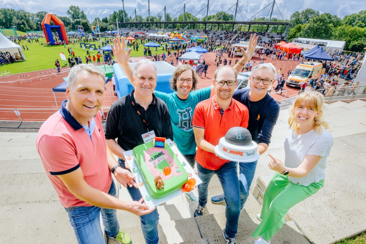 Foto (Besim Mazhiqi): Feiern gemeinsam mit tausenden Besuchern*innen die Jubiläumsausgabe des großen Radio Hochstift-Ferienfinales. Von links: Oliver Bekiersch (Sparkasse Paderborn-Detmold-Höxter), Martin Lausen (Radio Hochstift), herrH, Ralf Pahlsmeier (ASC Paderborn), Christian Müller (Stadtwerke Paderborn), und Maren Richts (Ahorn-Sportpark).